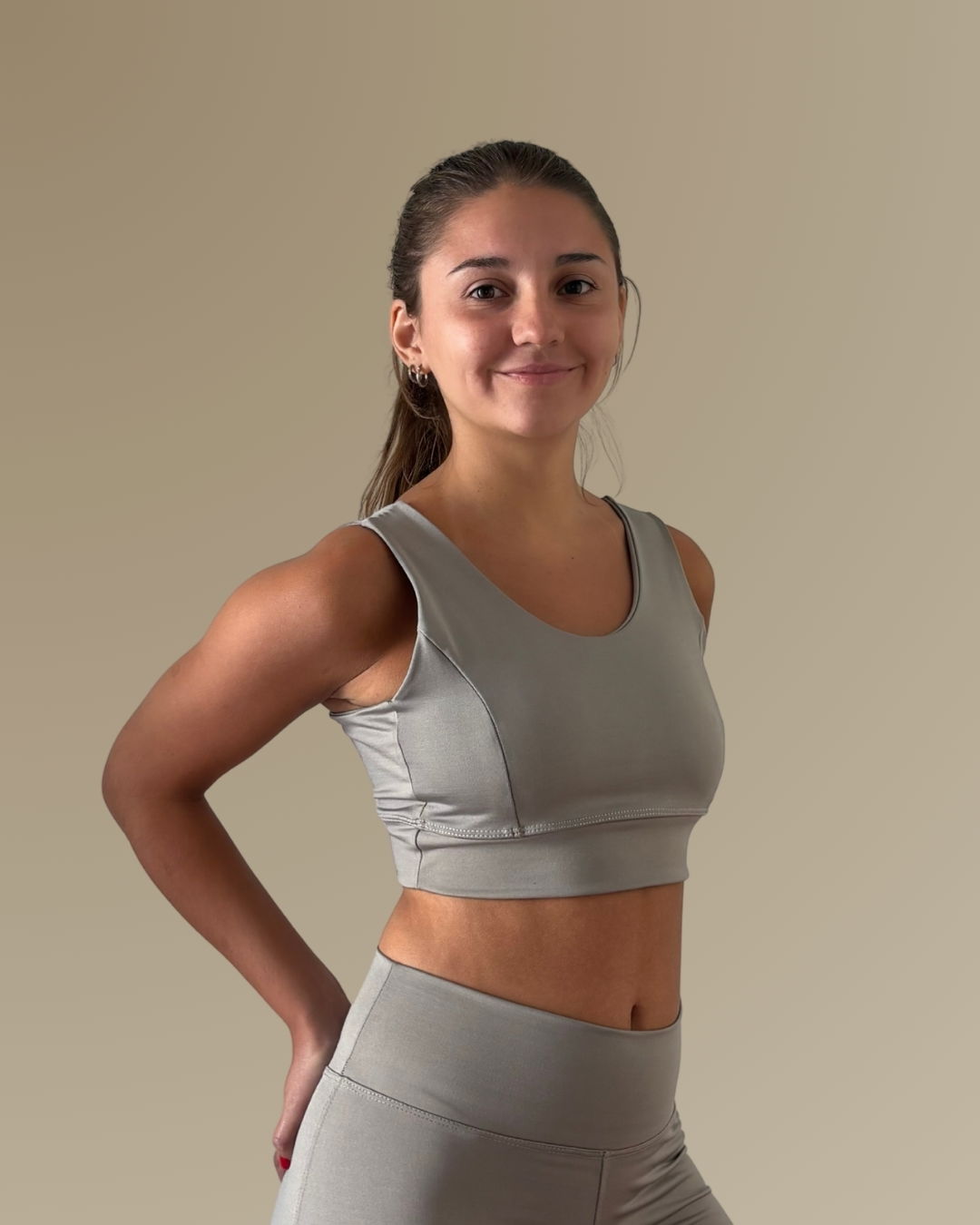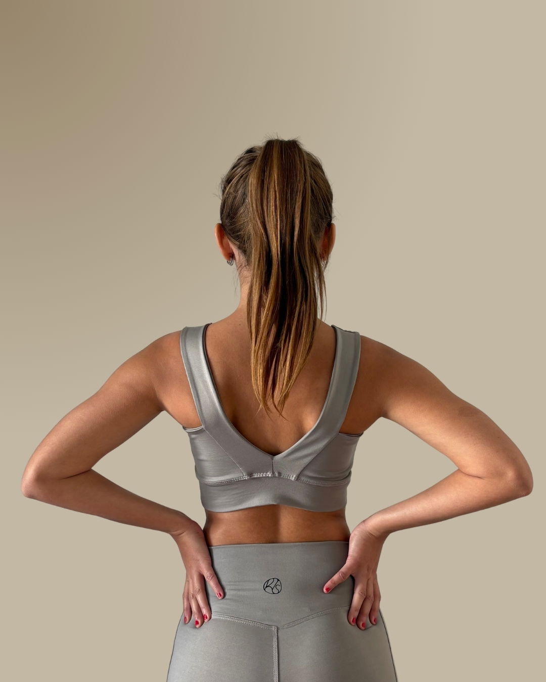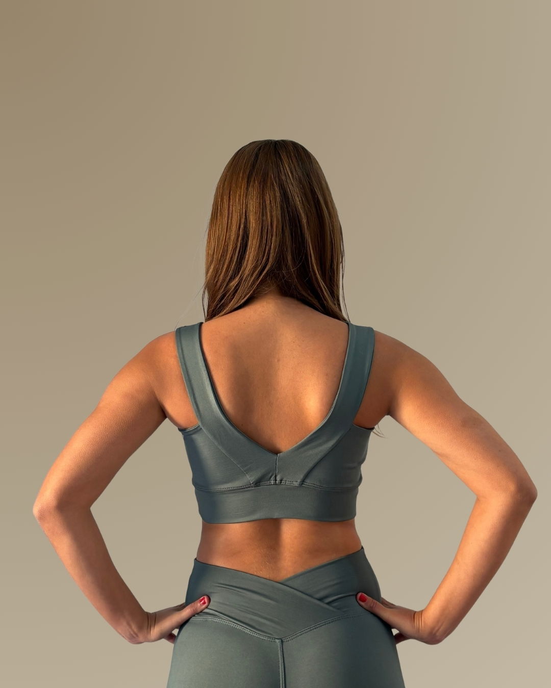 Top de microfibra pesada, doble rebote y opaca, con compresión que sostiene sin limitar. Su diseño con espalda corte en V acompaña el cuerpo brindando libertad de movimiento y seguridad en cada uso.